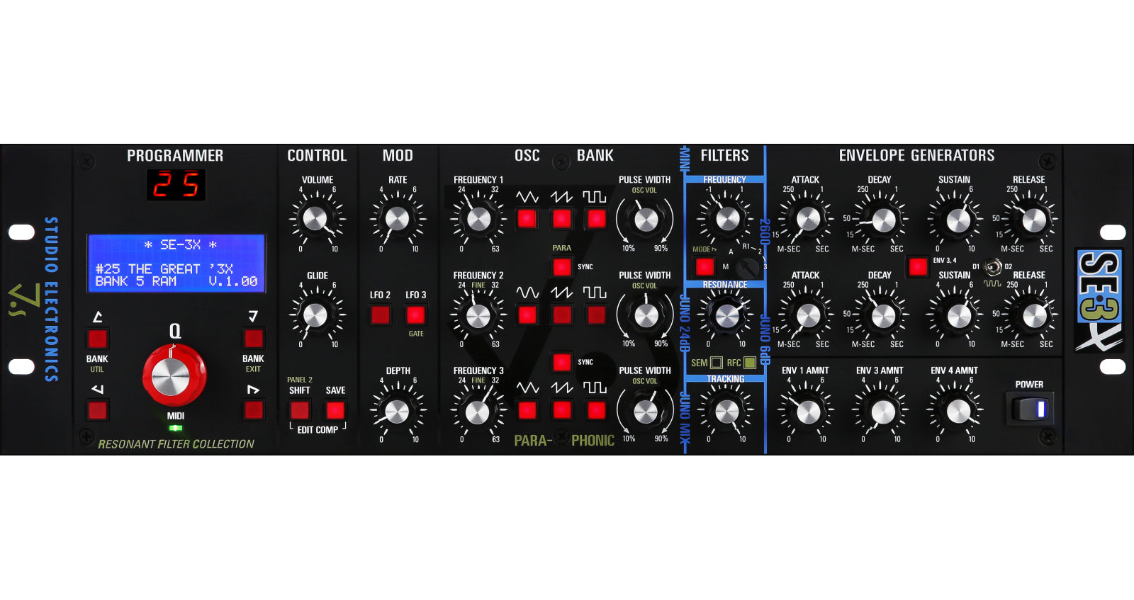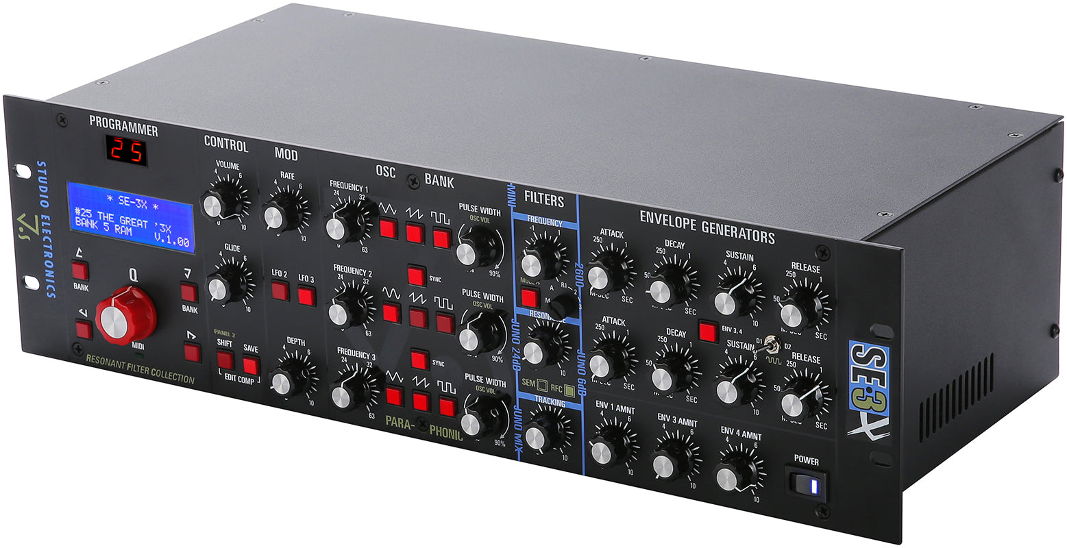 Three + Four = Heaven. The SE-3X: a 3-voice paraphonic synth with 4 discrete, classic hardware filters.
